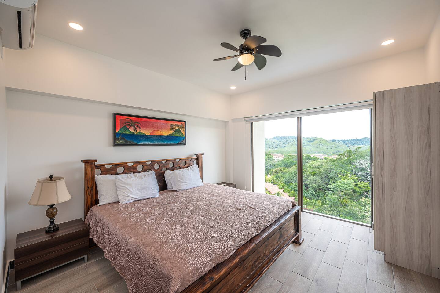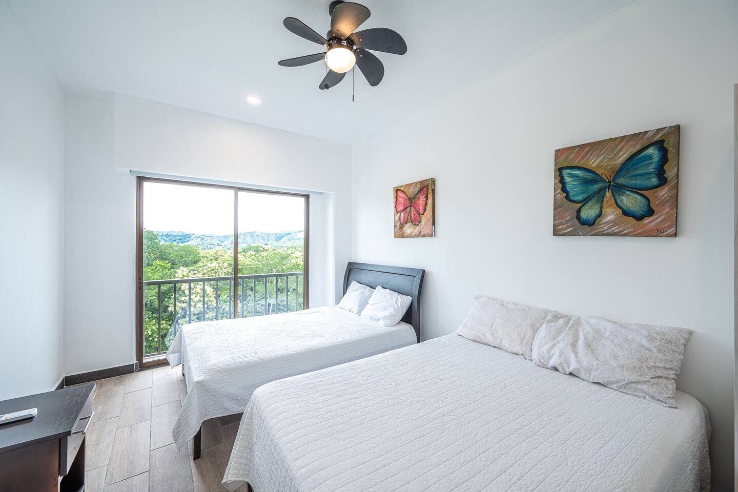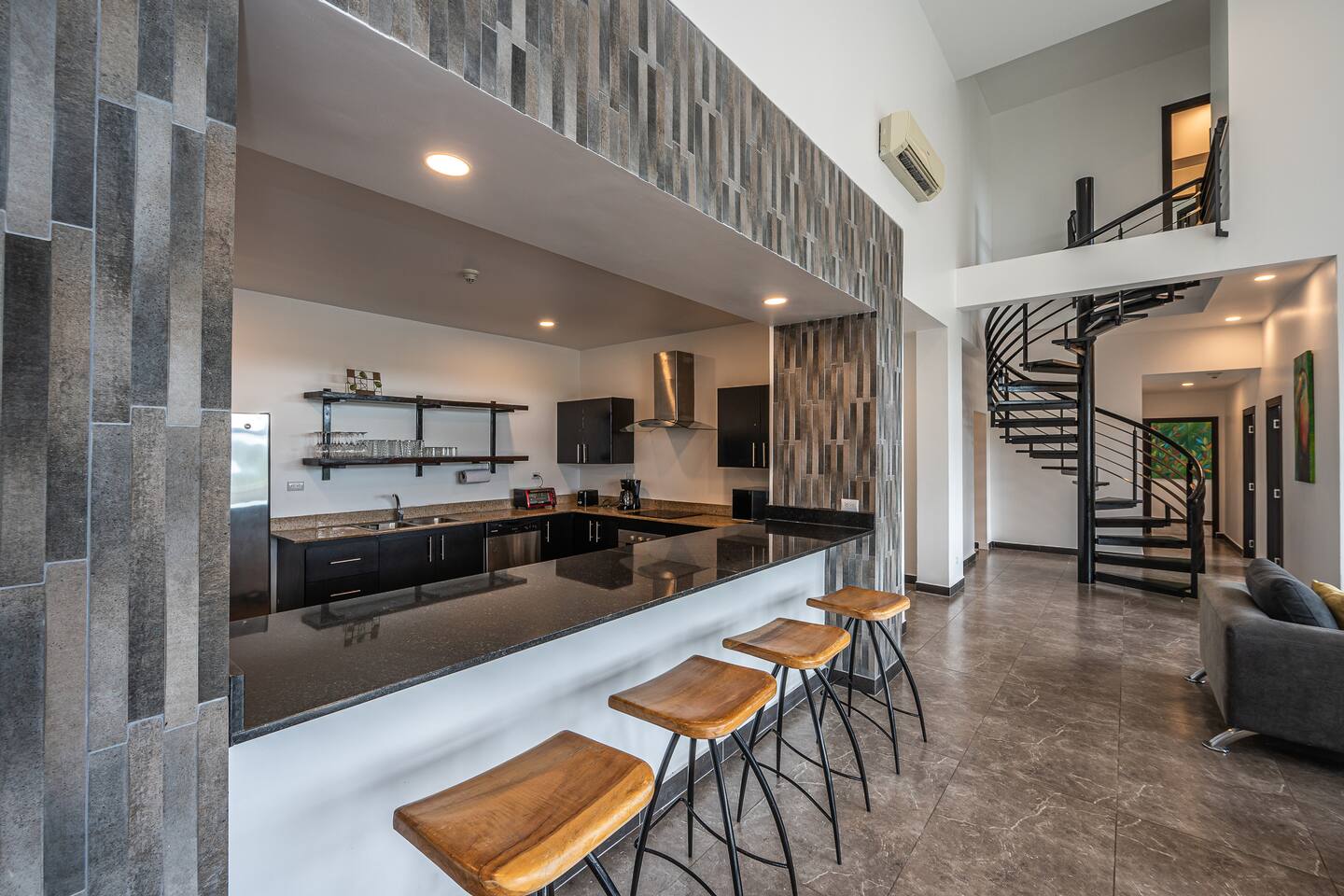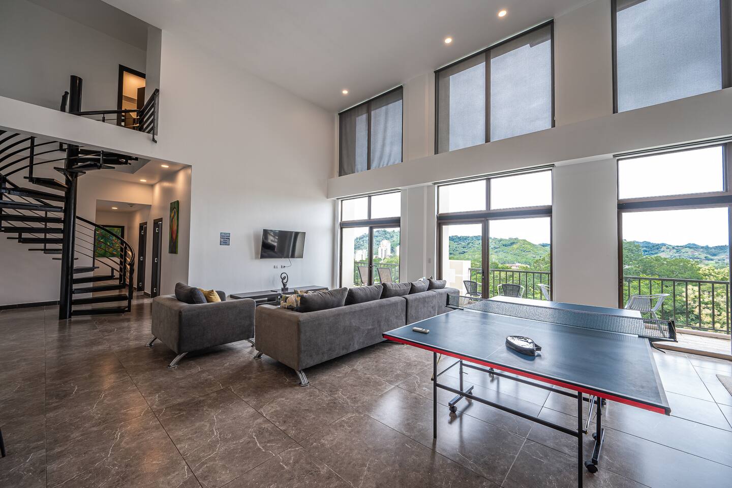 There are 7 bedrooms. One of those is a loft above the main living areas. It has a king bed and private bath. There is a master bedroom with a king bed and private bath. There is one bedroom with two twin beds and another room with a king bed. These two rooms share a bathroom. At the other end of the penthouse are two bedrooms with king beds that share a giant bathroom. There is a very small room with bunk beds off this bathroom. This condo is Rockstar cool. It is a full two stories and has 30-foot ceilings and is very modern. There is a large kitchen with bar seating for 8. The kitchen has everything you might need. The condo has 12 air conditioners. There is a large televisions with Netflix and other smart tv apps. We have fast internet and seamless WiFi throughout. This is the perfect in-town location. The pool is massive and beautiful. There is three jacuzzi tubs along with one of the largest swimming pools I have ever seen. This penthouse has a balcony that is 80 feet long with views of the Pacific ocean, the mountains and all of Jaco. This property will be the backdrop of a vacation you will never forget