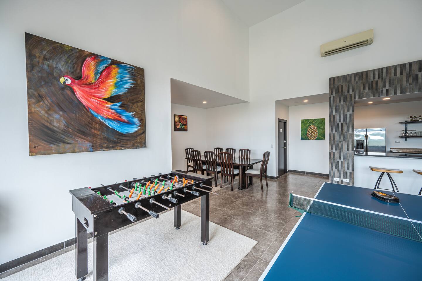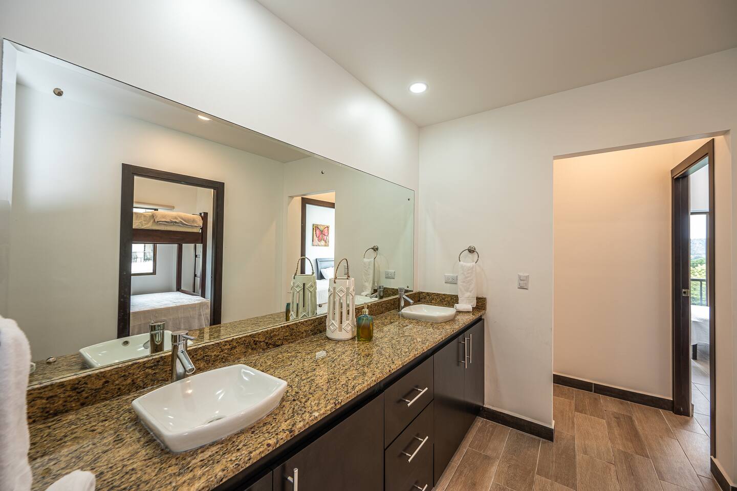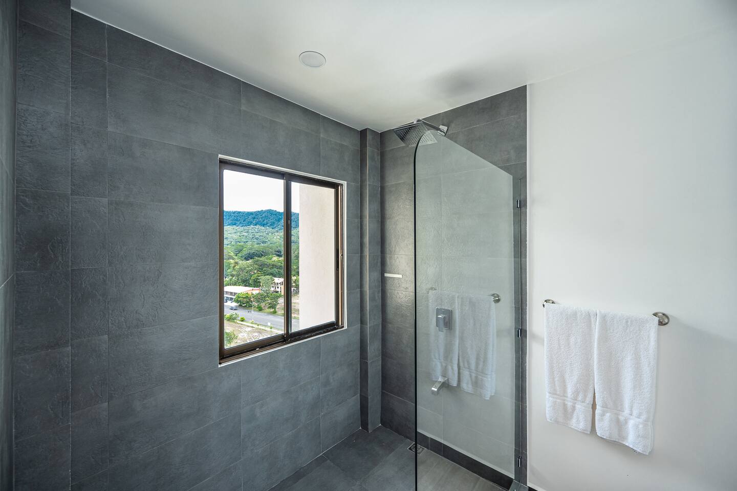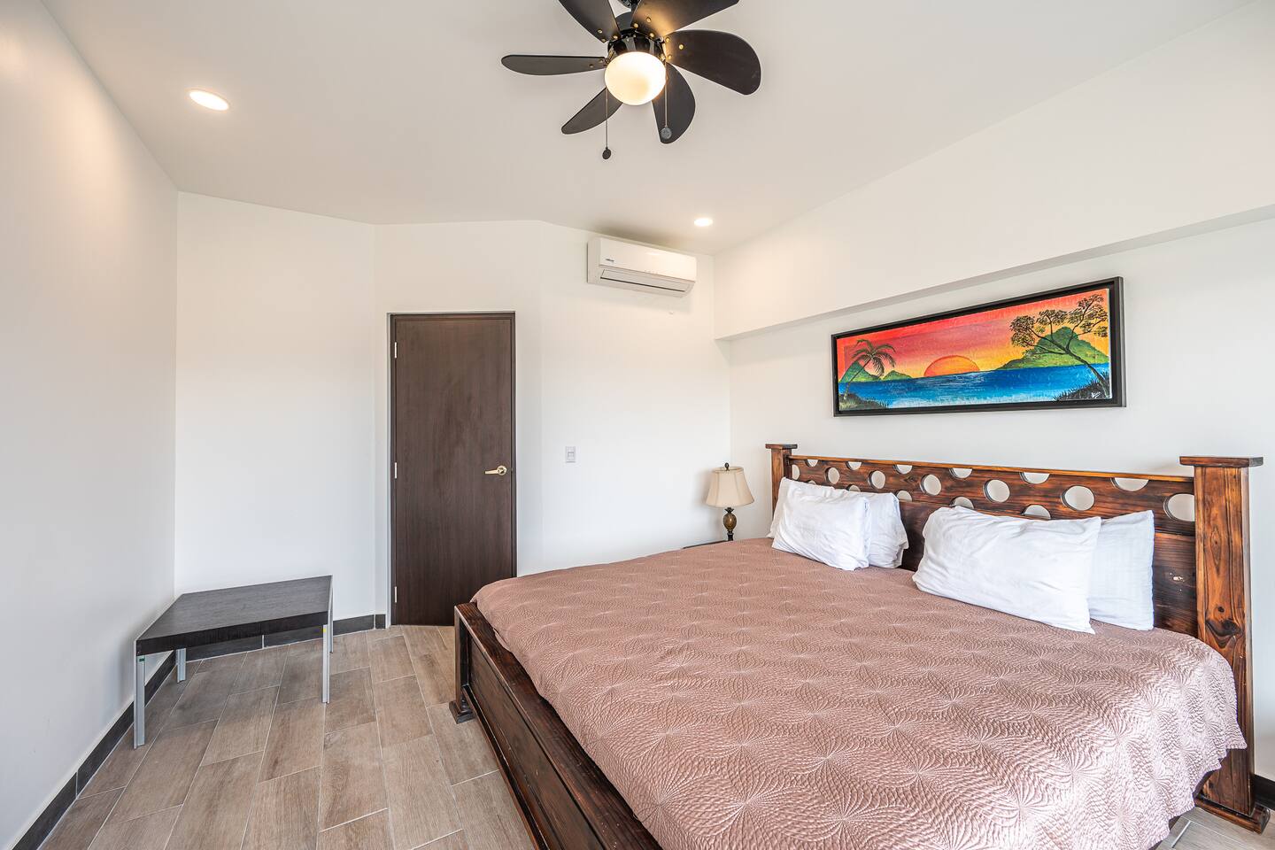 There are 7 bedrooms. One of those is a loft above the main living areas. It has a king bed and private bath. There is a master bedroom with a king bed and private bath. There is one bedroom with two twin beds and another room with a king bed. These two rooms share a bathroom. At the other end of the penthouse are two bedrooms with king beds that share a giant bathroom. There is a very small room with bunk beds off this bathroom. This condo is Rockstar cool. It is a full two stories and has 30-foot ceilings and is very modern. There is a large kitchen with bar seating for 8. The kitchen has everything you might need. The condo has 12 air conditioners. There is a large televisions with Netflix and other smart tv apps. We have fast internet and seamless WiFi throughout. This is the perfect in-town location. The pool is massive and beautiful. There is three jacuzzi tubs along with one of the largest swimming pools I have ever seen. This penthouse has a balcony that is 80 feet long with views of the Pacific ocean, the mountains and all of Jaco. This property will be the backdrop of a vacation you will never forget