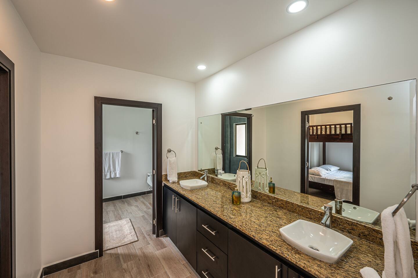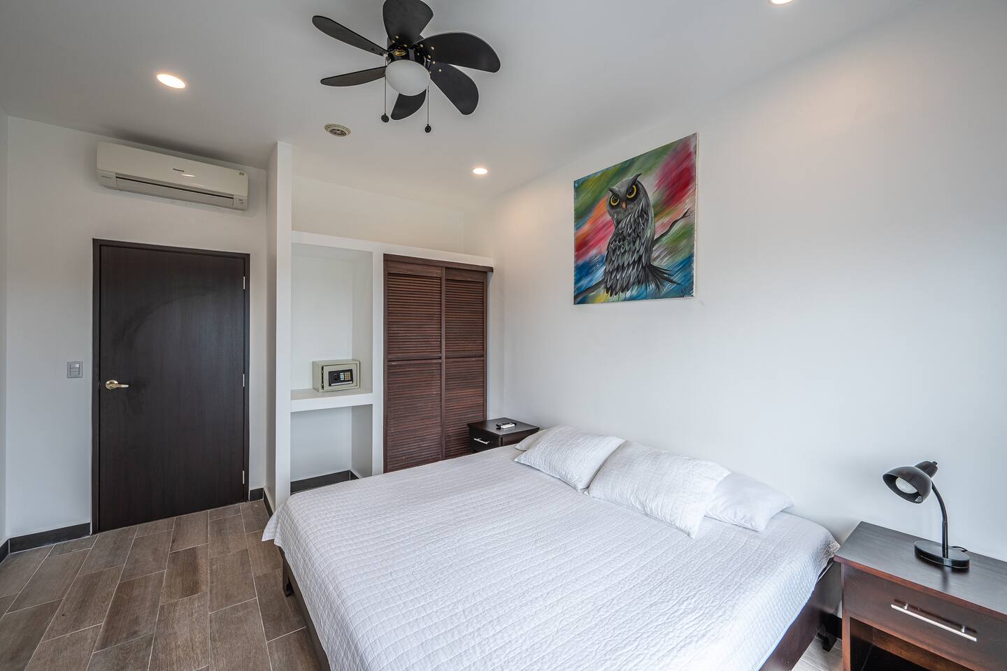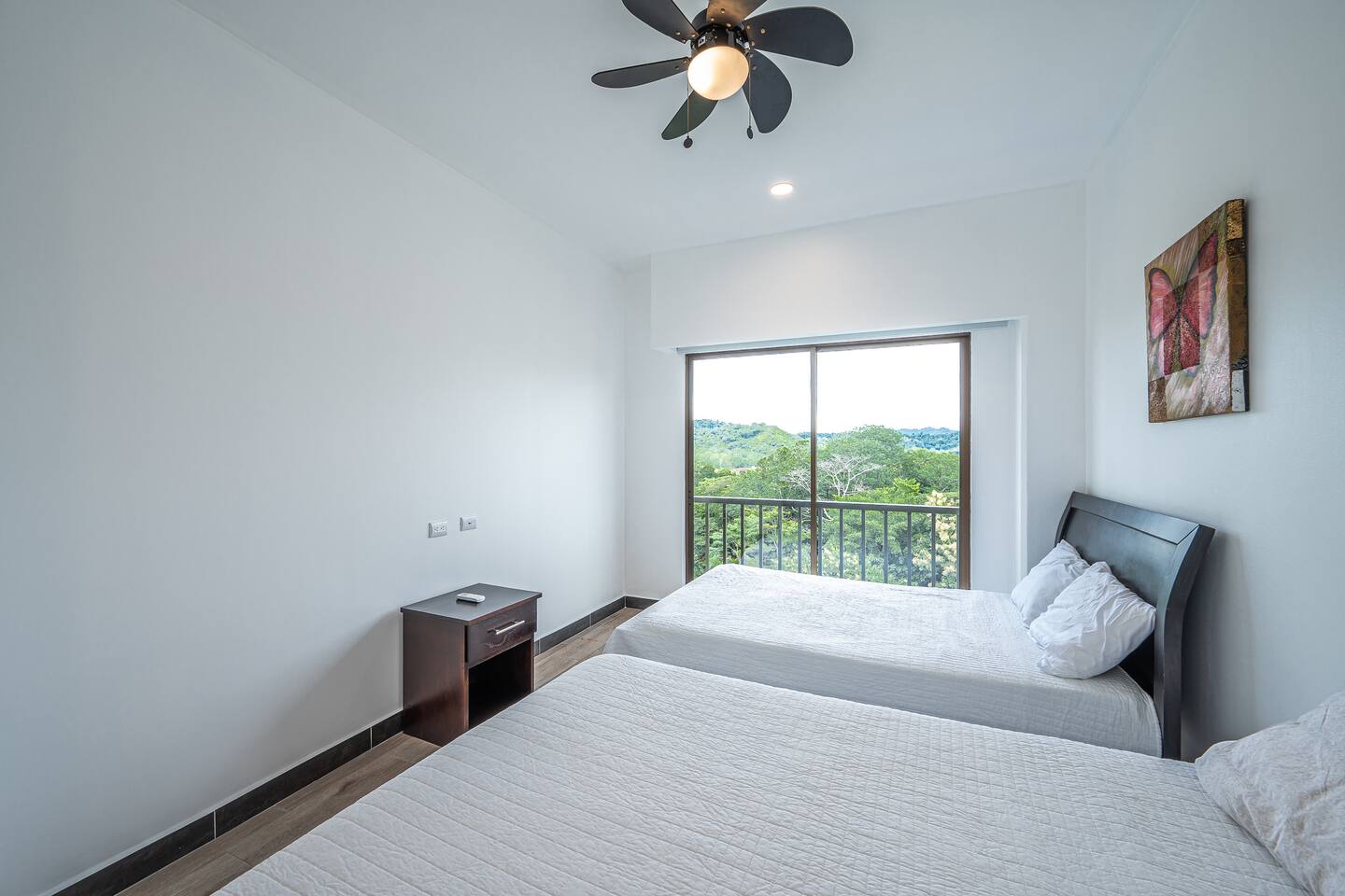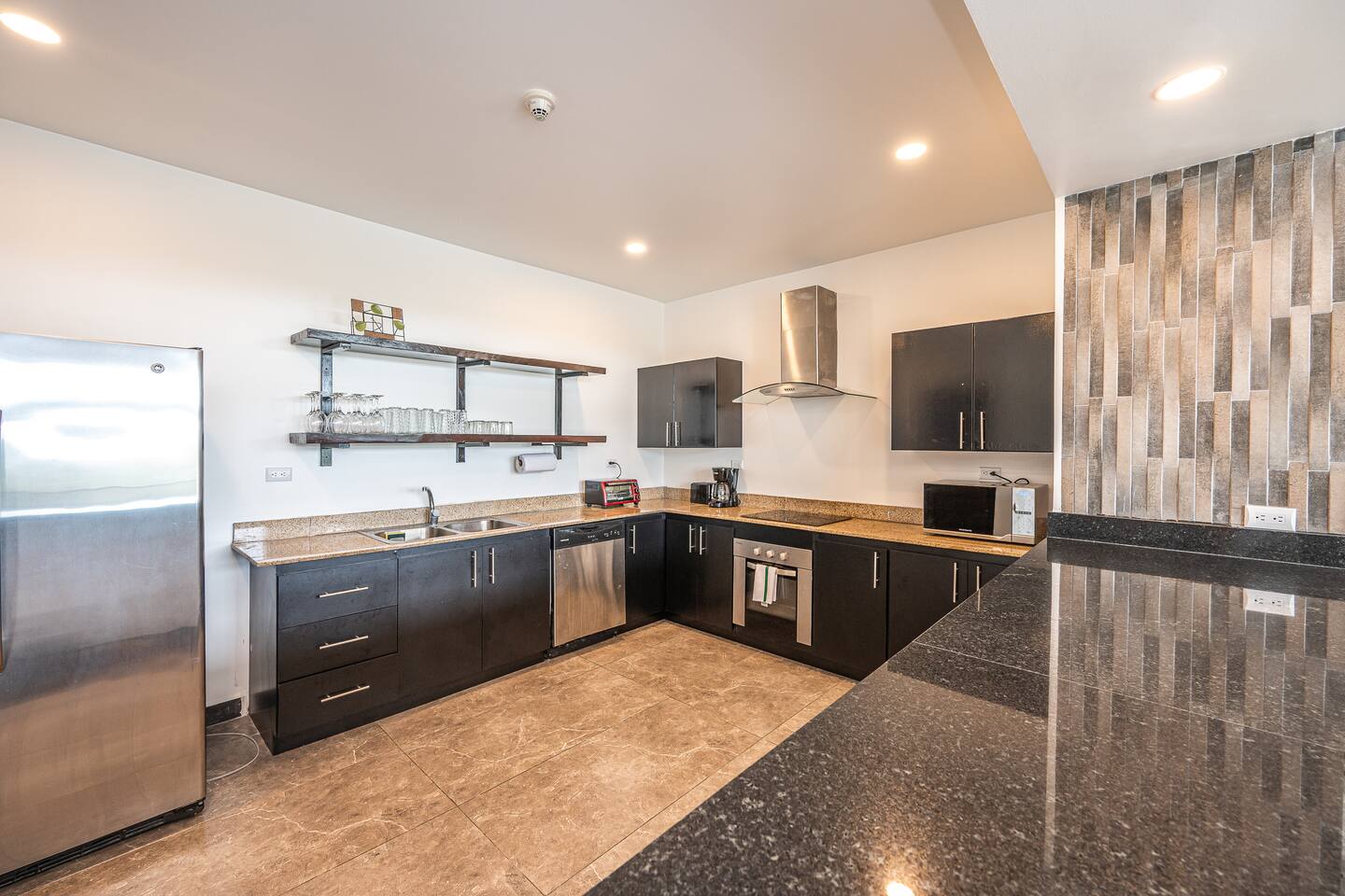 There are 7 bedrooms. One of those is a loft above the main living areas. It has a king bed and private bath. There is a master bedroom with a king bed and private bath. There is one bedroom with two twin beds and another room with a king bed. These two rooms share a bathroom. At the other end of the penthouse are two bedrooms with king beds that share a giant bathroom. There is a very small room with bunk beds off this bathroom. This condo is Rockstar cool. It is a full two stories and has 30-foot ceilings and is very modern. There is a large kitchen with bar seating for 8. The kitchen has everything you might need. The condo has 12 air conditioners. There is a large televisions with Netflix and other smart tv apps. We have fast internet and seamless WiFi throughout. This is the perfect in-town location. The pool is massive and beautiful. There is three jacuzzi tubs along with one of the largest swimming pools I have ever seen. This penthouse has a balcony that is 80 feet long with views of the Pacific ocean, the mountains and all of Jaco. This property will be the backdrop of a vacation you will never forget